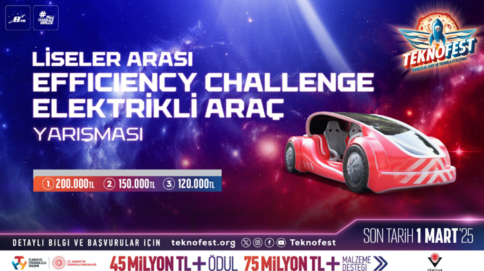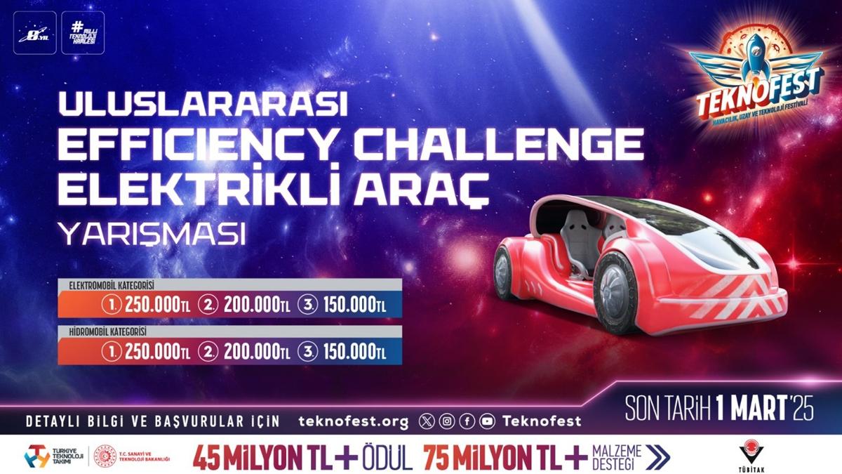 TEKNOFEST Havacılık, Uzay ve Teknoloji Festivali kapsamında, TÜBİTAK tarafından düzenlenen Uluslararası Efficiency Challenge Elektrikli Araç Yarışları ile yine TÜBİTAK tarafından düzenlenen Liseler Arası Efficiency Challenge Elektrikli Araç Yarışları tasarımından teknik donanımına kadar gençler tarafından hazırlanan elektrikli araçların mücadelesine sahne olacak. Efficiency Challenge Elektrikli Araç Yarışları için başvurular 1 Mart tarihine kadar devam ediyor.