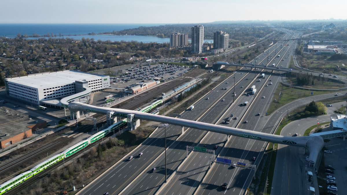 Kanada'nın Ontario eyaletinin Pickering şehrindeki Guinness Dünya Rekoru sahibi Pickering Yaya Köprüsü havadan görüntülendi. Toronto'nun 45 dakika doğusunda, 14 şeridi, altı aktif demiryolu hattı ve iki şeritli yerel yolu olan 401 numaralı otoban üzerinde yer alan 250 metrelik köprünün gece aydınlatması için de 300 LED ışık kullanılıyor.