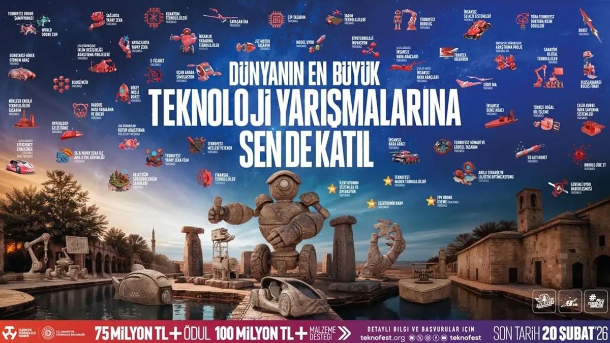 Dünyanın en büyük havacılık, uzay ve teknoloji festivali TEKNOFEST kapsamında düzenlenen 2026 yılı teknoloji yarışmalarına başvurular başladı. Bu yıl yeni adresi Şanlıurfa olan TEKNOFEST, 75 milyon TL ödül ve 100 milyon TL'den fazla maddi desteğiyle genç zihinleri yeni keşiflere davet ediyor. Fikirleri projeye, projeleri geleceğe dönüştürmek isteyenler için yarışma başvuruları 20 Şubat'a kadar devam ediyor!