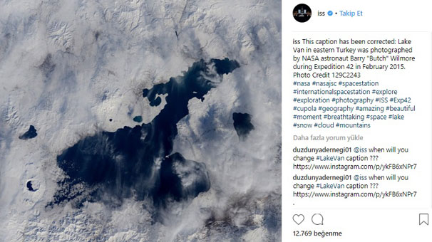 Instagram hesabında 1 Şubat 2015 tarihinde bir NASA astronotu tarafından Van Gölü'nün uzaydan çekilmiş fotoğrafını, 'Himalayalar'da karla kaplı bir göl' diye paylaşan ISS, Düz Dünya Derneği Başkanı Doğukan Özkan'ın örgütlediği Türk sosyal medya kullanıcılarının tepkisinin ardından bu hatayı aradan geçen 3,5 yılın ardından düzeltti.