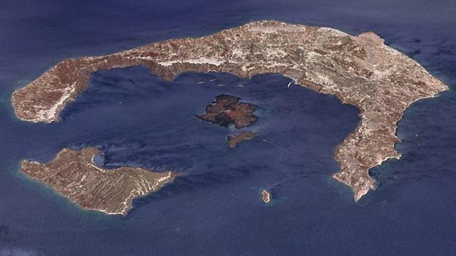 Santorini Adası, 19 Haziran 2019, RASAT uydu görüntüsü (3 boyutlu gösterim)
