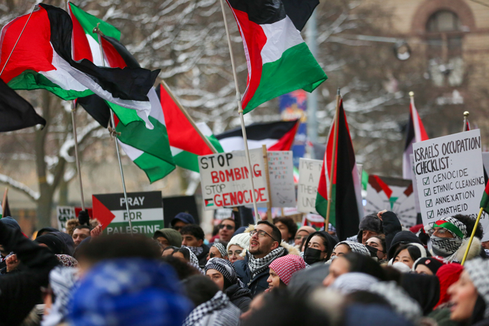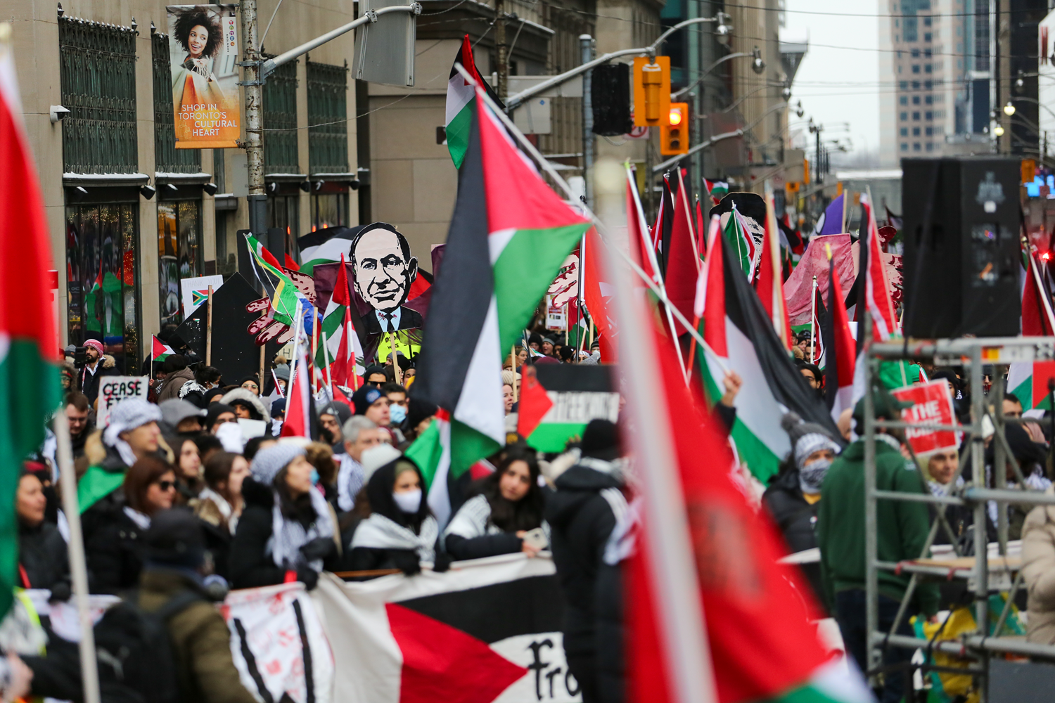 Kanada'nın Ontario eyaletine bağlı Toronto kentinde, Gazze soykırımı kınanarak İsrail'e tepki sloganlarının atıldığı Filistin'e destek gösterisi düzenlendi.