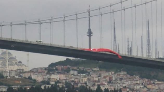 15 Temmuz darbe girişiminin 4'üncü yıl dönümü nedeniyle 15 Temmuz Şehitler Köprüsü'ne dev bir Türk bayrakları asıldı.