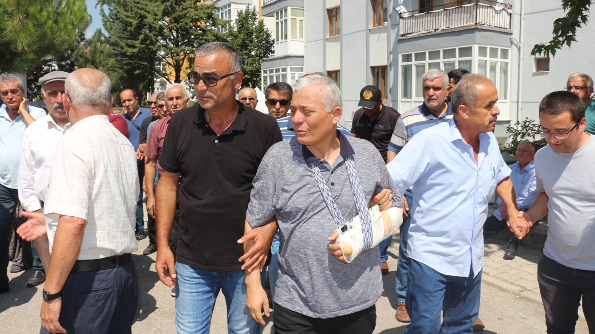 Kazada yaralanan baba Kılıç ve abla Gamze Yavuz, kırık kolları alçıya alınmış halde cenaze törenine katıldı.