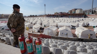 Kahramanmaraşlı depremzedeler için Şazibey Mahallesi'ndeki 12 Şubat Stadı'nda kurulan çadır kentin asayişini sağlayan Kara Kuvvetleri Eğitim ve Doktrin Komutanlığı (EDOK) Taburu, katalitik sobalarla ısıtılan çadırlarda bir yangın riskine karşı teyakkuzda bekliyor.