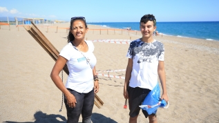 2 yıldır yaz aylarında çadırda "yaşam nöbeti" tutan anne oğul, her gün sahilde yuvaları tespit etmek amacıyla 4 saat yürüyor, bu sırada poşetlerle de çöpleri topluyor.