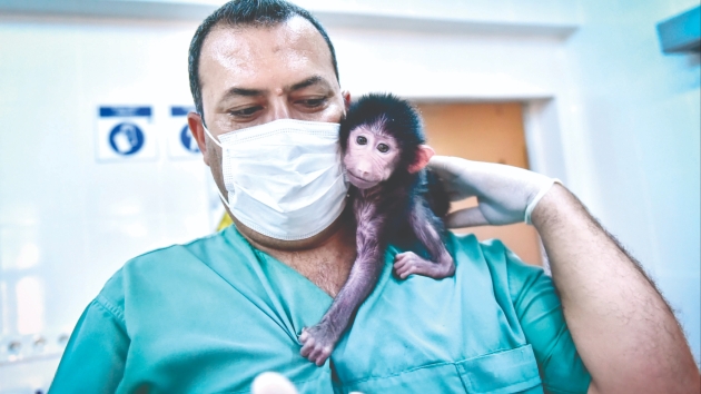 Mersin'deki Tarsus Doğa Parkı'nda doğan ancak annesi reddedince kuvözde büyütülen babun maymunu "Nisan", veterinerler tarafından doğal ortamına alıştırılmaya çalışılıyor.