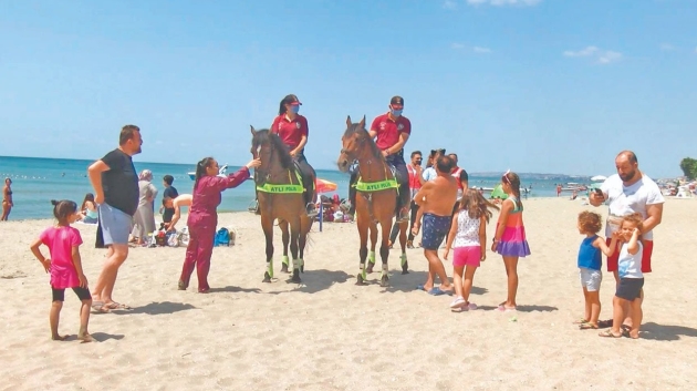 Plajda bulunanlar atlı polis birliklerine yoğun ilgi gösterdi.