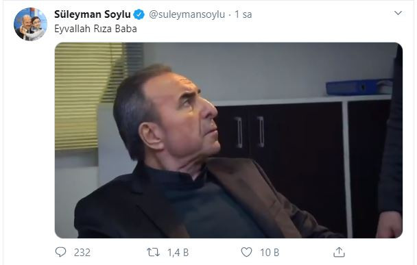 İçişleri Bakanı Süleyman Soylu, Arka Sokaklar dizisinde Zafer Ergin'in canlandırdığı Rıza Baba'nın bekçilerle ilgili olan bölümünü Twitter hesabından 'Eyvallah RIza Baba' diyerek paylaştı. Soylu'nun paylaşımına kısa sürede binlerce beğeni geldi.