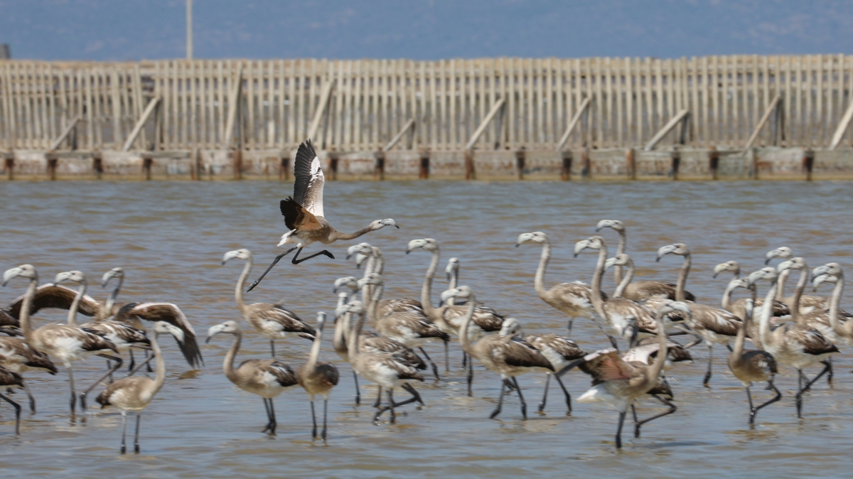 Flamingoların üreme sahası İzmir Kuş Cenneti'ndeki yapay kuluçka adasında bir süre önce dünyaya gelen yavrular, suda yapay adanın hemen önünde yer alan ve "kreş" olarak adlandırılan bölgede, rüzgara karşı kanat çırparak uçmayı öğreniyor.