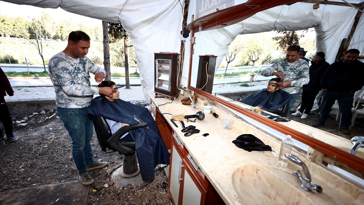 Hatay'ın Kırıkhan ilçesinde berberlik yapan İlhan Öztürk, Kahramanmaraş merkezli depremlerde ağır hasar gören dükkanından kurtarabildiği malzemelerle 30 metrekarelik çadırda müşterilerine hizmet veriyor.
