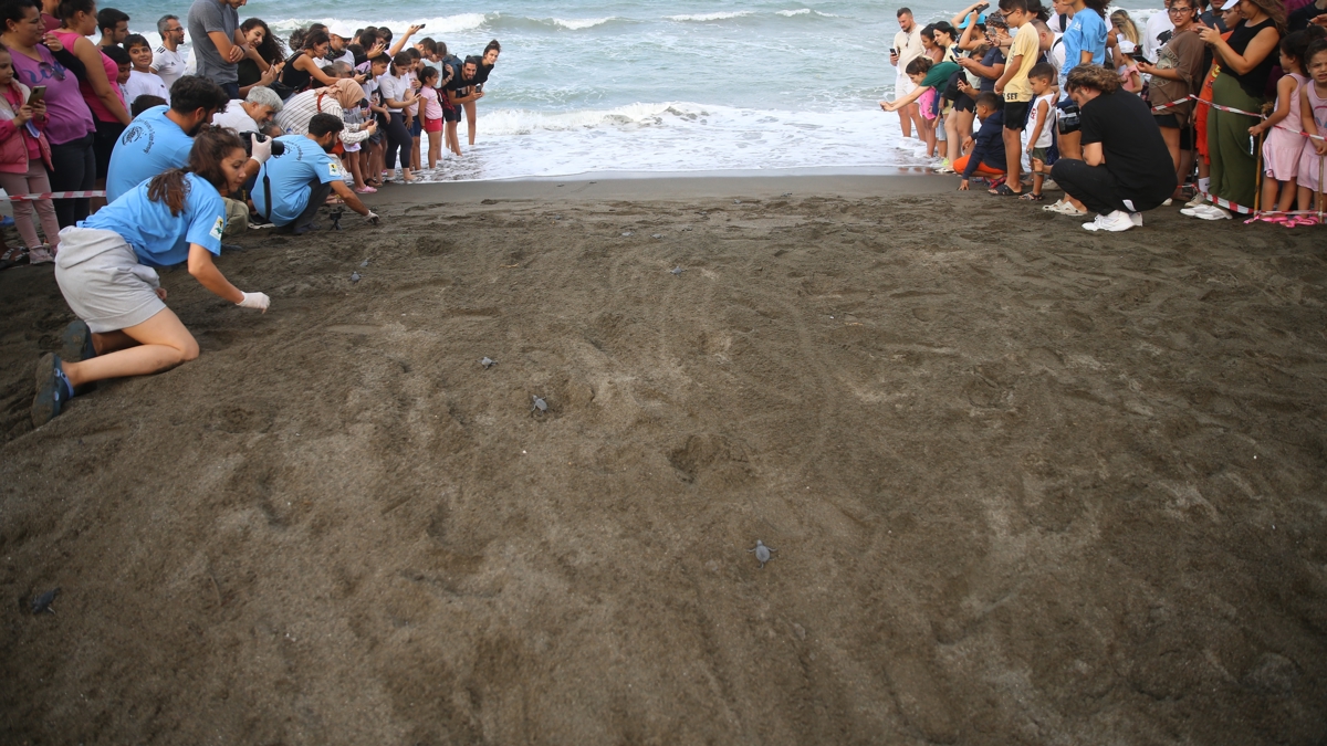 Hatay'ın Samandağ ilçesinde yumurtalarından çıkan yeşil deniz kaplumbağası ve caretta caretta yavrularının denize yolculuğu başladı.