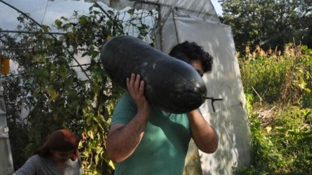Bartın’ın Kozcağız beldesinde Müyesser Acıbal, tohumunu komşusundan alıp ektiği Çin salatalıkları 1 metre uzunluğa, 30 kilo ağırlığa ulaşınca paniğe kapıldı. Müyesser Acıbal, her geçen gün daha da büyüyen salatıkları kökünden söküp, sebzeleri komşularına dağıttı.