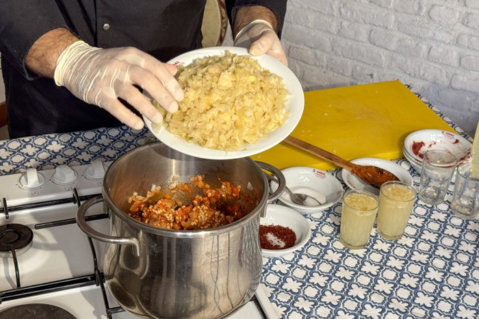 - Soğanlar küp küp doğranarak tencereye ilave edilir ve pembeleşinceye kadar pişirilir.