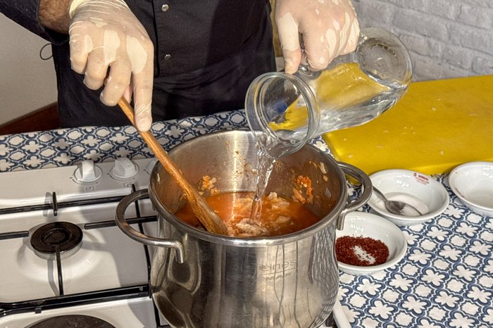 - Çorti, aşurelik buğday, pul biber, tuz, salça, çorti suyu ve içme suyu tencereye eklenir.