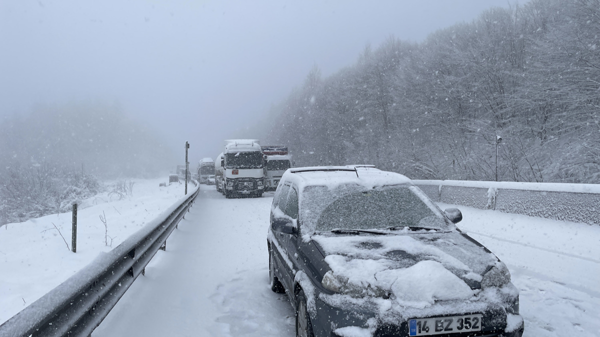 D-100 kara yolunun Bolu Dağı kesiminde etkisini artıran kar yağışı, ulaşımı olumsuz etkiliyor.