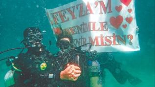 Yalova'da erkek arkadaşının daveti üzerine ilk kez dalışa giden 24 yaşındaki Feyza Ünal, su altında aldığı evlilik teklifiyle iki mutluluğu bir arada yaşadı. 27 yaşındaki Kenan Esen, evlilik teklifi için bir dalış kulübünden de destek aldı.