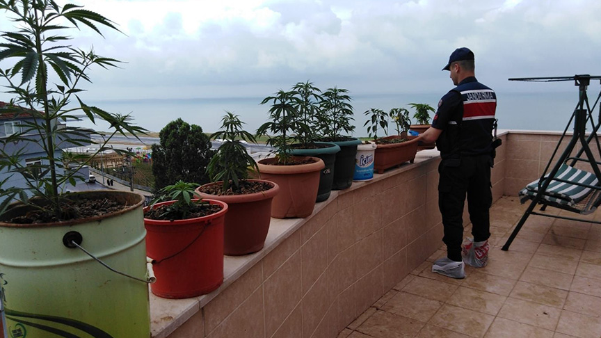 Deniz manzaralı balkonunda saksılar içinde esrar yetiştirmiş