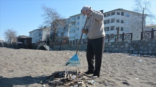 Düzce'nin Akçakoca ilçesinin mavi bayraklı plajlarından Çuhallı'da, dalgaların sürüklediği plastik ve metal atık, ayakkabı, ağaç parçaları ve yosunları gören emekli öğretmen Mehmet Berber, tırmıkla temizlik çalışması gerçekleştiriyor.