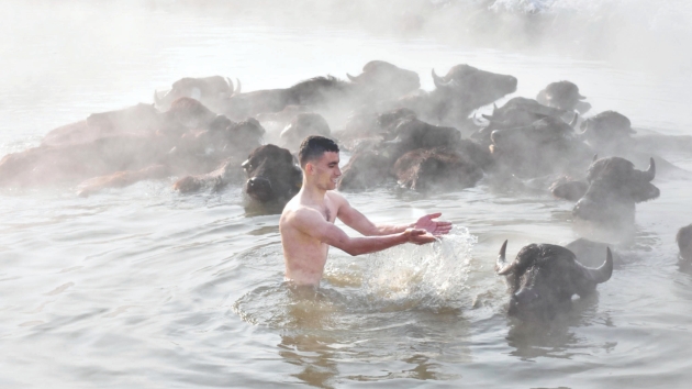 Gençler, hava sıcaklığının sıfırın altında 10 dereceyi bulduğu bölgede, su sıcaklığının ise 35- 40 dereceye çıktığı kaplıcada hayvanları ile yüzmenin keyfini çıkarıyor.