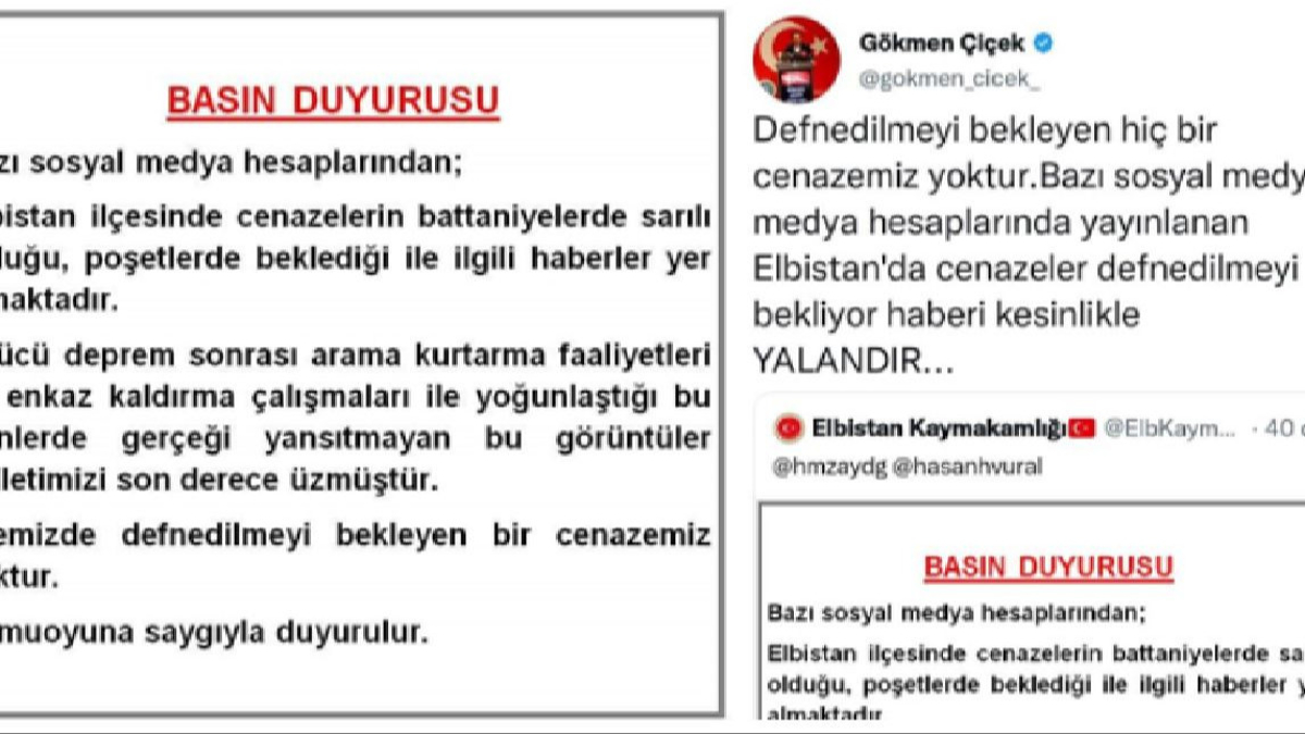 Elbistan Kaymakamlığı tarafından yapılan açıklamada, "Bazı sosyal medya hesaplarından; Elbistan ilçesinde cenazelerin battaniyelere sarılı olduğu, poşetlerle beklediği yönünde haberler yer almaktadır. Üzücü deprem sonrası arama kurtarma faaliyetleri ile enkaz kaldırma çalışmaları ile yoğunlaştığı bu günlerde gerçeği yansıtmayan bu görüntüler milletimizi son derece üzmüştür. İlçemizde defnedilmeyi bekleyen bir cenazemiz yoktur. Kamuoyuna saygıyla duyurulur" ifadelerine yer verildi.