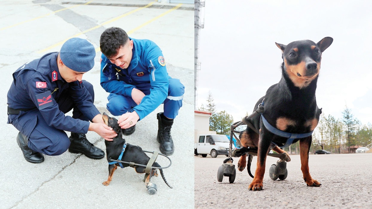 Karaman İl Jandarma Komutanlığı Bakım Onarım Bölüğü'nde görevli Uzman Çavuş Mikail Sarıtaş, yol kenarında bulduğu yaralı köpeğin önce hayatta kalmasını, ardından da geri dönüşüm malzemelerinden yaptığı aparatla ayağa kalkmasını sağladı.