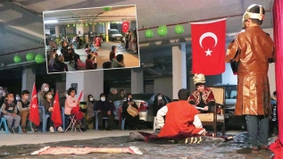 Kış aylarında hava sıcaklığının sıfırın altından 30 derecenin altına düştüğü Erzurum'da daha önce bina önleri ile site içi ve tarihi mekanlarda gösteriler yapan çocuklar, özellikle salgın döneminde bina altındaki garajlarda gösteri yapmaya başladı. Katılımcıların sosyal mesafeye uyup maske taktığı gösteri öncesinde üşümemek için böyle bir yola başvuran tiyatrocuların hazırladıkları gösteriler ayakta alkışlanıyor.