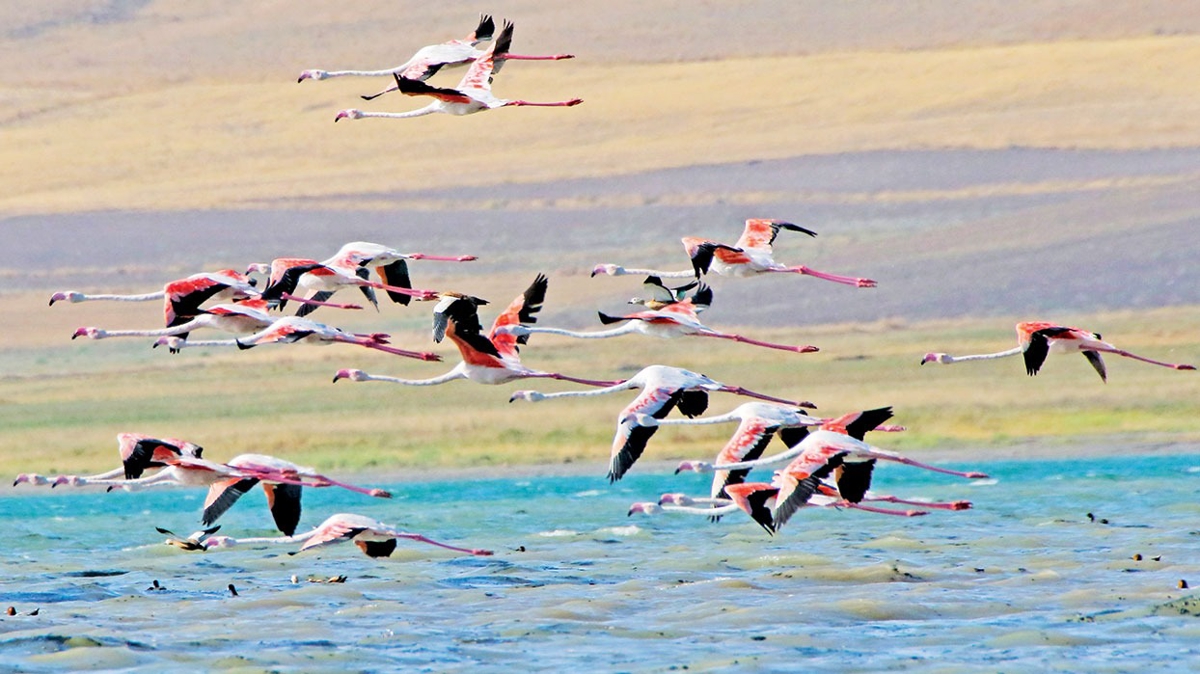 Van Gölü havzasına gelerek Erçek Gölü ve çevresinde konaklayan flamingolar, Erciş ve Muradiye sahillerinde de görülüyor.
