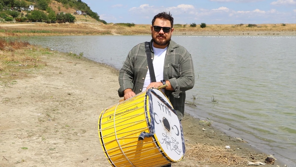 Tekirdağlı müzisyen Ahmet Merih Çelik, su seviyesi düşen Bıyıkali Göleti'nde davul çalarak azalan su kaynaklarına dikkati çekti.