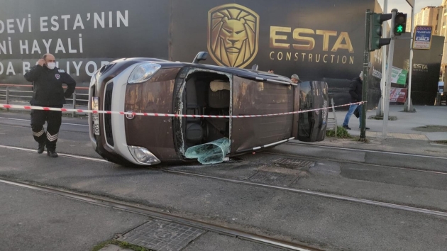 Savrulan sürücü kursu aracı tramvay yolunda yan yattı. Kaza nedeniyle tramvay seferlerinde aksama oldu.