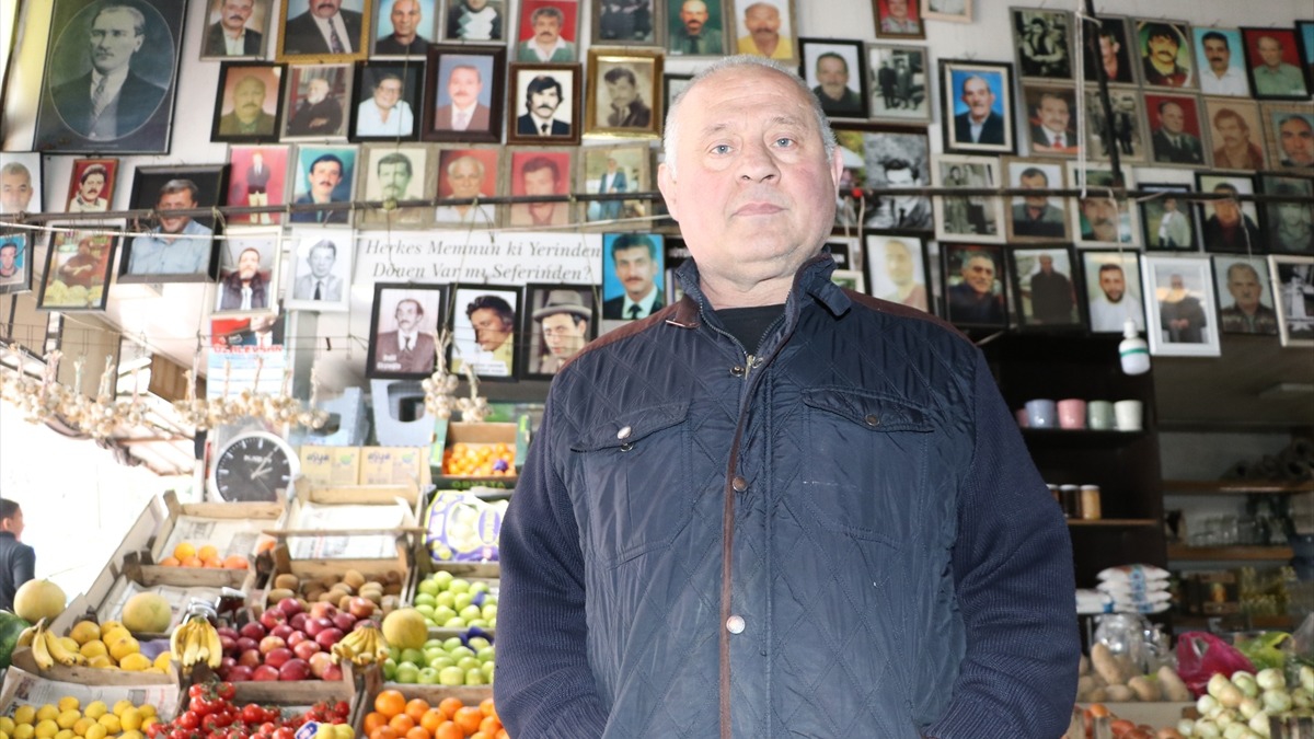 Kaybettiği sevdiklerinin hatıralarını manav dükkanına astığı fotoğraflarla yaşatıyor.