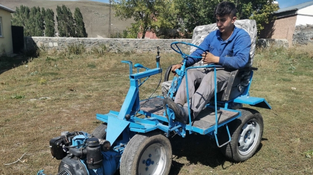 Kars'ın Arpaçay ilçesinde yaşayan lise öğrencisi Ahmet Ada (17), hurdadan topladığı malzemelerle ATV yaptı. Test sürüşleri de yapan Ahmet Ada "Bütün malzemeleri hurdadan topladım. ATV, her türlü arazi şartında gayet rahatlıkla gidebiliyor" dedi.