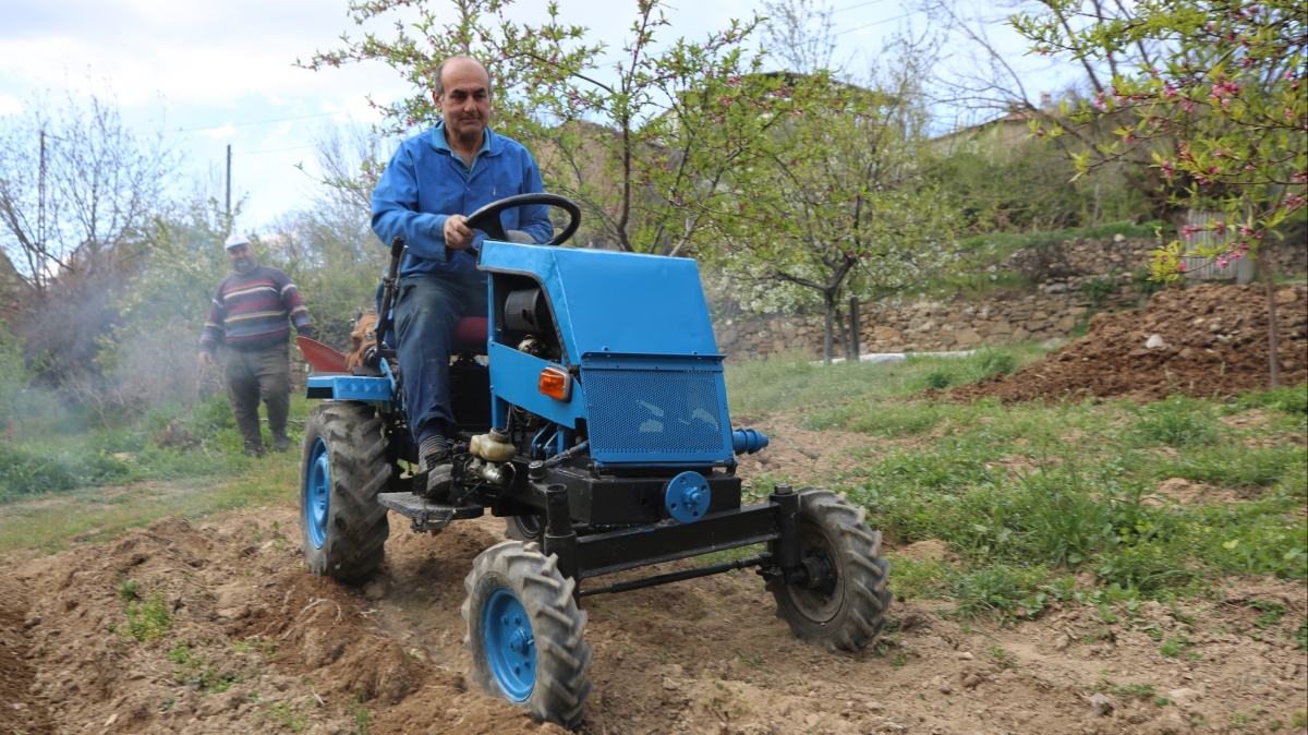 Elazığ'ın Keban ilçesinde yaşayan oto elektrik ustası Kadir Öner, normal bir traktörün giremediği engebeli arazideki bahçesini sürebilmek için hurda otomobil parçaları kullanarak mini traktör yaptı.