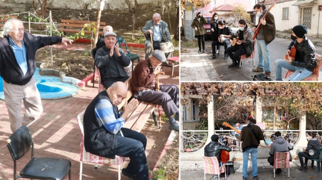 Burdur'da üniversite öğrencileri huzurevi sakinlerine, bahçe duvarı arkasından moral konseri verdi. Öğrenciler kaldırımda çalıp söyledi, hatırlanmanın mutluluğunu yaşayan ihtiyarlar kalkıp göbek attı.