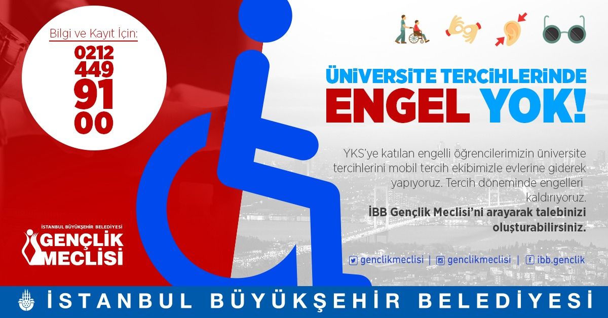 Mobil tercih hizmetinden yararlanmak isteyen engelli üniversite adayları, (212) 449 91 00 numaralı telefondan İBB Gençlik Meclisi’ni arayarak kayıt yaptırabilecekler. Kayıt işlemini gerçekleştiren gençler, 1-15 Ağustos 2018 tarihleri arasında İBB Gençlik Meclisi’nin mobil tercih ekipleriyle tercihlerini yapabilecekler.