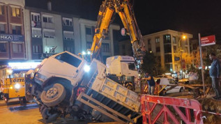 Üsküdar'da, İSKİ'nin kazı çalışması kapsamında hafriyat yüklenen kamyonet, yolda meydana gelen çökme nedeniyle düştüğü çukurdan vinç yardımıyla çıkarıldı.