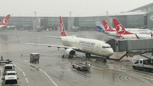 Etkili olan yağış sonrası İstanbul Havalimanı pisti üzerinde bulunan park halindeki uçak ve araçların üzerinde kar birikintisi oluştu.