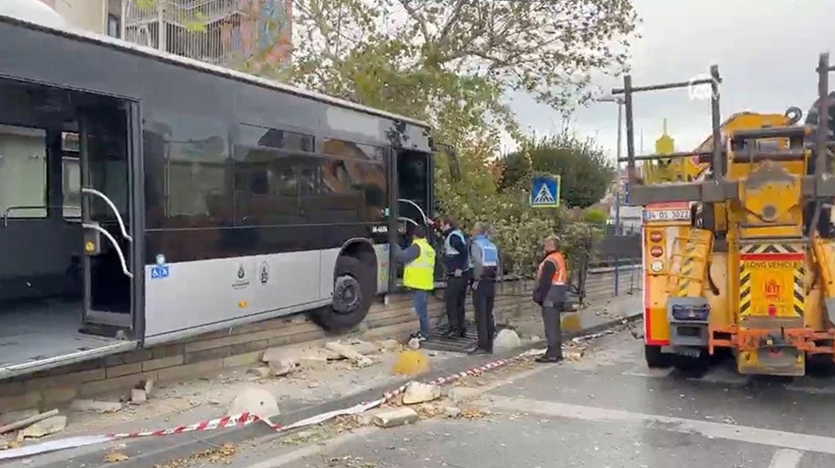 Kadıköy'de metrobüs belediyenin bahçe duvarına çarpıp asılı kaldı
