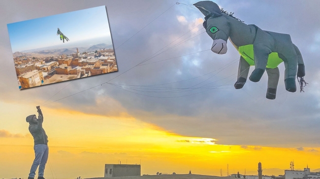 Mardin'de yaptığı uçurtmalarla gökyüzünü renklendiren uçurtma ustası Zahit Mungan (25), kentin sembolü haline gelen ve çöp toplama işlerinde kullanılan eşeklerin 8 metre büyüklüğünde 3 boyutlu uçurtmasını yaptı.