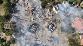 Rüzgarın etkisiyle kısa sürede büyüyen yangında 10 ev yandı.