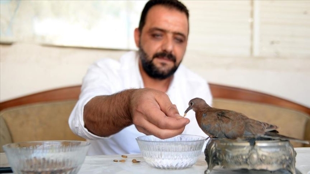 Kilis'te annesiz kalan kumru yavrusu hayvansever esnaf tarafından şırıngayla beslenerek büyütülüyor.