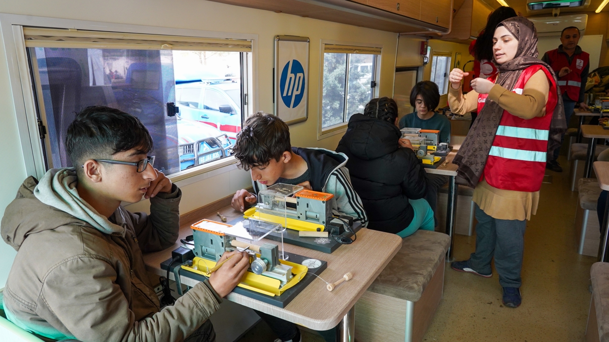 Türk Kızılay Bursa Şubesi ile Ermetal Teknolojik Eğitimler Vakfı, depremlerin merkez üssü Kahramanmaraş'ta depremzede çocuklara robotik kodlama eğitimi veriyor. İki eğiticinin görev aldığı karavanda, çocuklara 3 boyutlu yazıcı, ahşap tasarım atölyesi, mini torna, robotik kodlama gibi eğitimler veriliyor. Karavandan, günde ortalama 100 çocuk faydalanıyor.