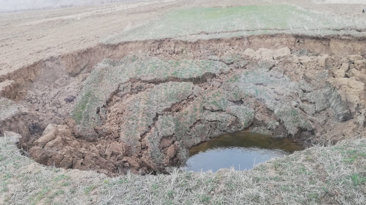 Sivas'ın Zara ilçesi Çanova köyünde bir tarlada depremden sonra obruk oluştu.