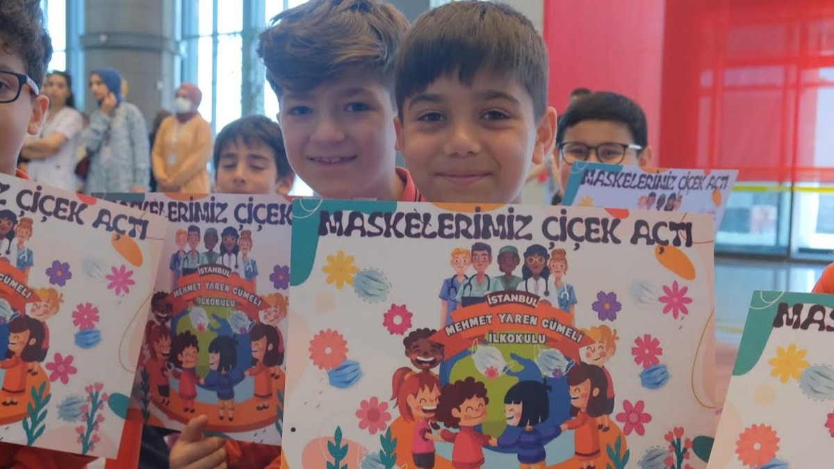İstanbul'da Başakşehir Mehmet Yaren Gümeli İlkokulu Yöneticileri, öğretmen Şenay Özer ve 3-F Sınıfı öğrencileri 'Maskelerimiz Çiçek Açtı' etkinliği kapsamında Çam ve Sakura Şehir Hastanesi'ni ziyaret etti. Öğrenciler, hastane yönetimi ve sağlık çalışanlarıyla bir araya gelerek pandemiye dair şiirler okudu.