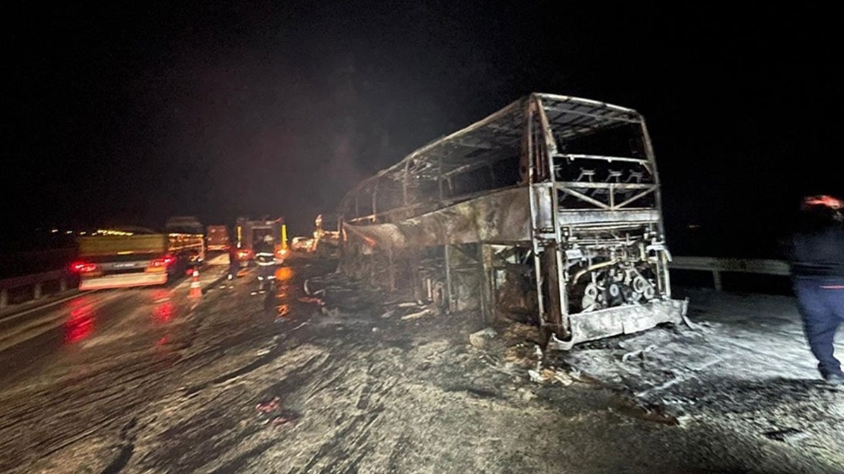 Kazanın ardından alev alan otobüste yangın çıktı.