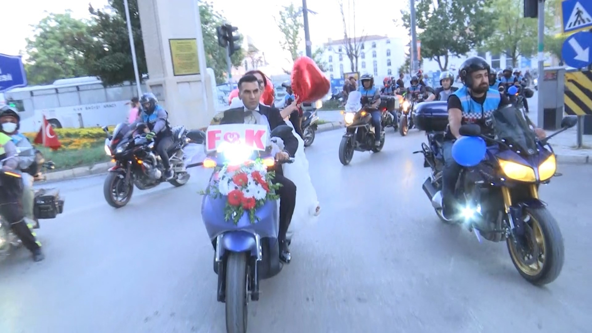 Yaklaşık 30 motosikletten oluşan düğün konvoyu, ortaya renkli görüntüler çıkardı. Motorcu konvoyu, vatandaşların büyük ilgisiyle karşılaştı. Düğün salonunda da halay ve çiftetellinin yerini motosiklet şovu aldı. Motorcuların gösterisi davetlilerden alkış aldı.