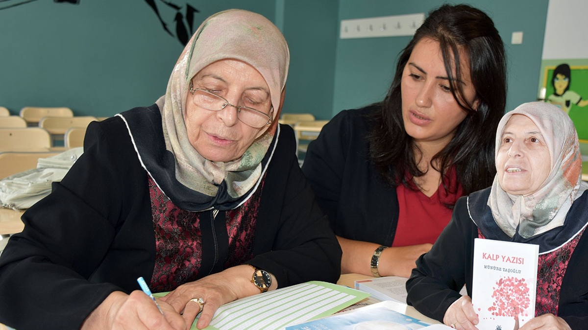 Okuma yazması olmadığı için şiirlerini komşu çocuklarına yazdıran Münüre Nine 69 yaşında okuma yazma öğrendi, 72'sinde şiir kitabı çıkardı. ‘Kalp Yazısı' adını verdiği kitabın mutluluğunu yaşayan yaşlı kadın şimdi de hayat hikayesini kaleme alacak.