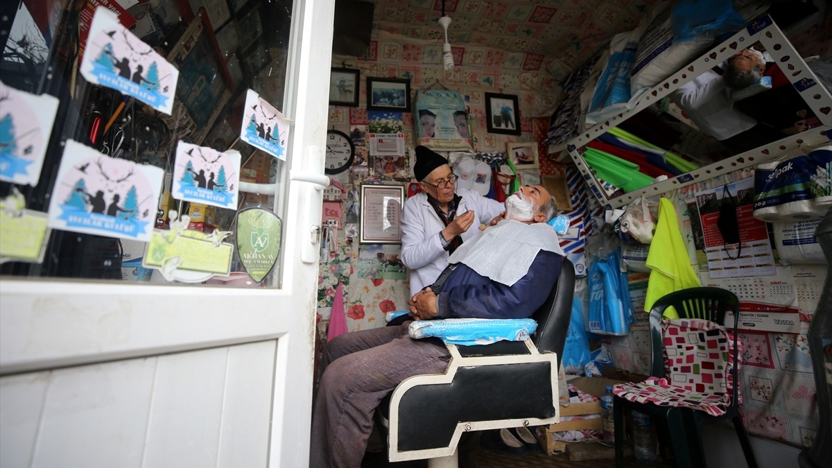Kırklareli'nde "musluksuz berber" olarak tanınan Cemal Yumurtacı, 4 metrekarelik dükkanında müşterilerine hizmet veriyor.