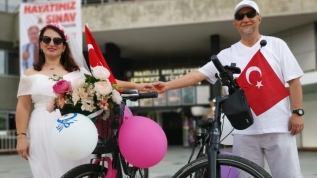 Aydın'ın Nazilli ilçesinde bisiklet tutkunu Funda Işık ve Ayhan Tütüncü, gelin arabası gibi süsledikleri bisikletleriyle konvoy yaptı. Bisikletli gelin ve damat arkadaşlarıyla birlikte şehir turu atarken, görenler de o anları cep telefonları ile kaydederek ölümsüzleştirdi.