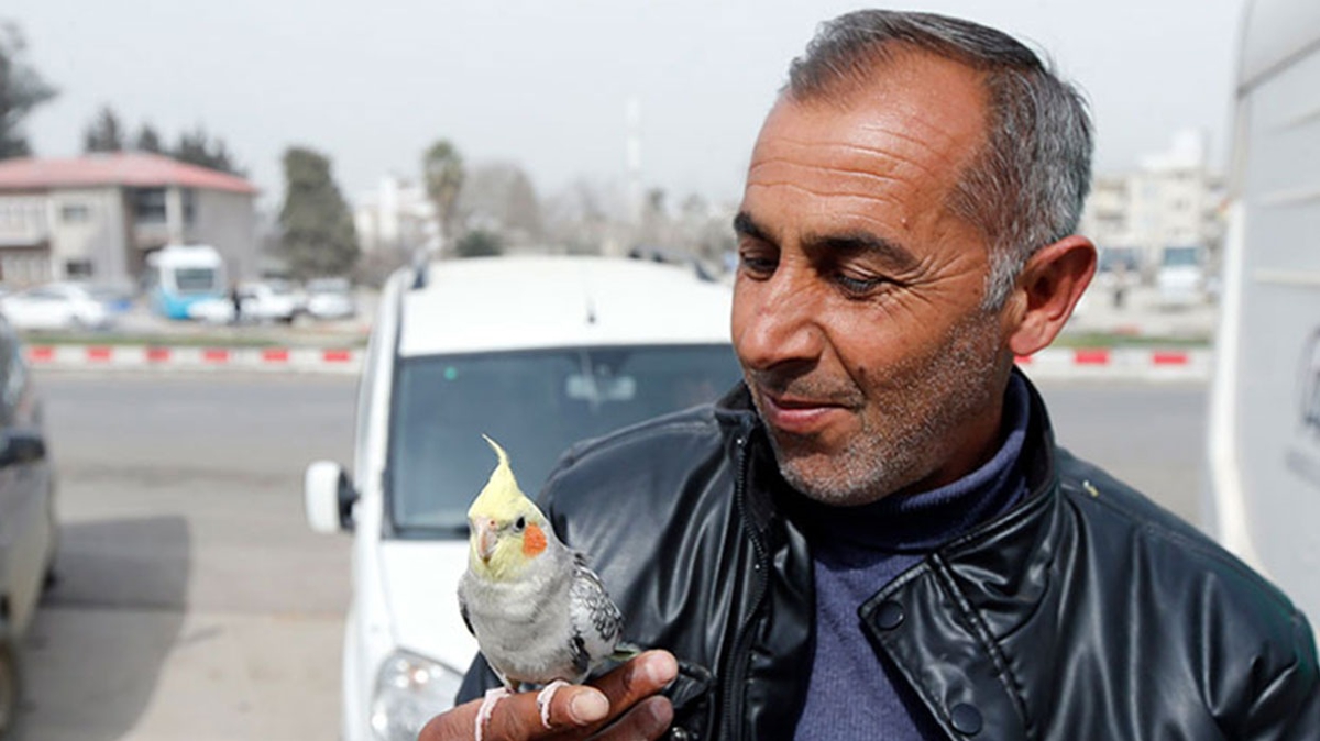 Depremlerin etkilediği Adıyaman'da, 10 Şubat'ta bir arkadaşının ailesini enkazdan çıkarmak için çalışan Hassari Figen'in omzuna, dinlenmek için oturduğu sırada bir sultan cinsi bir papağan kondu.